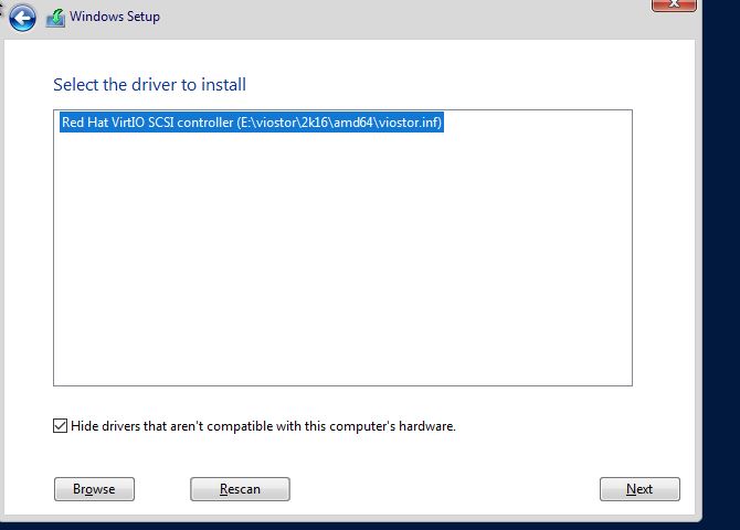 Vælg CD-rom dreven med Virtio-win-0.1.1 cden og gå til /VIOSTOR/2k16/amd64